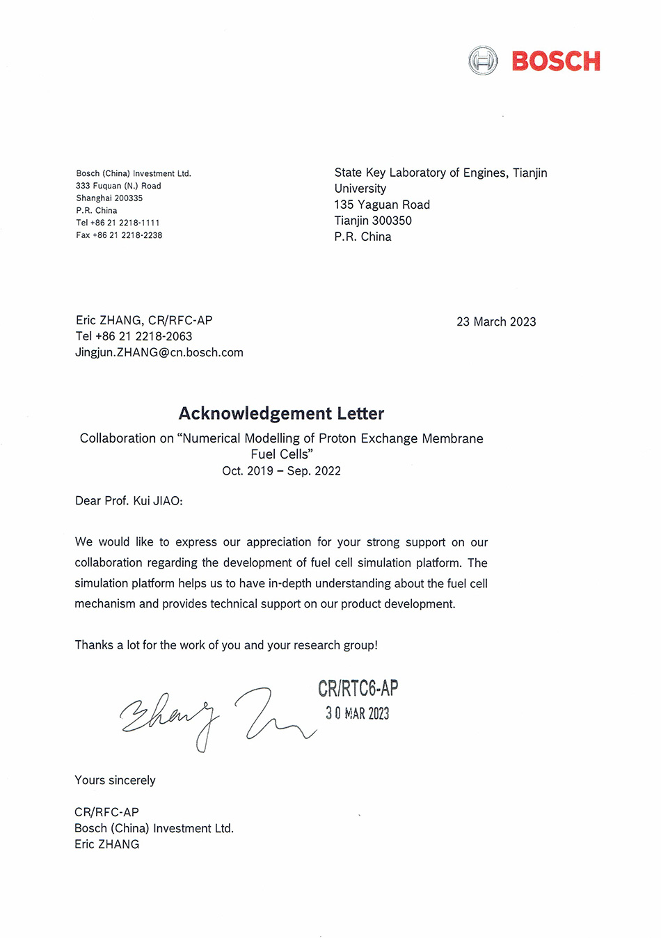 Prof. Jiao’s research facilitated Bosch’s fuel cell product development